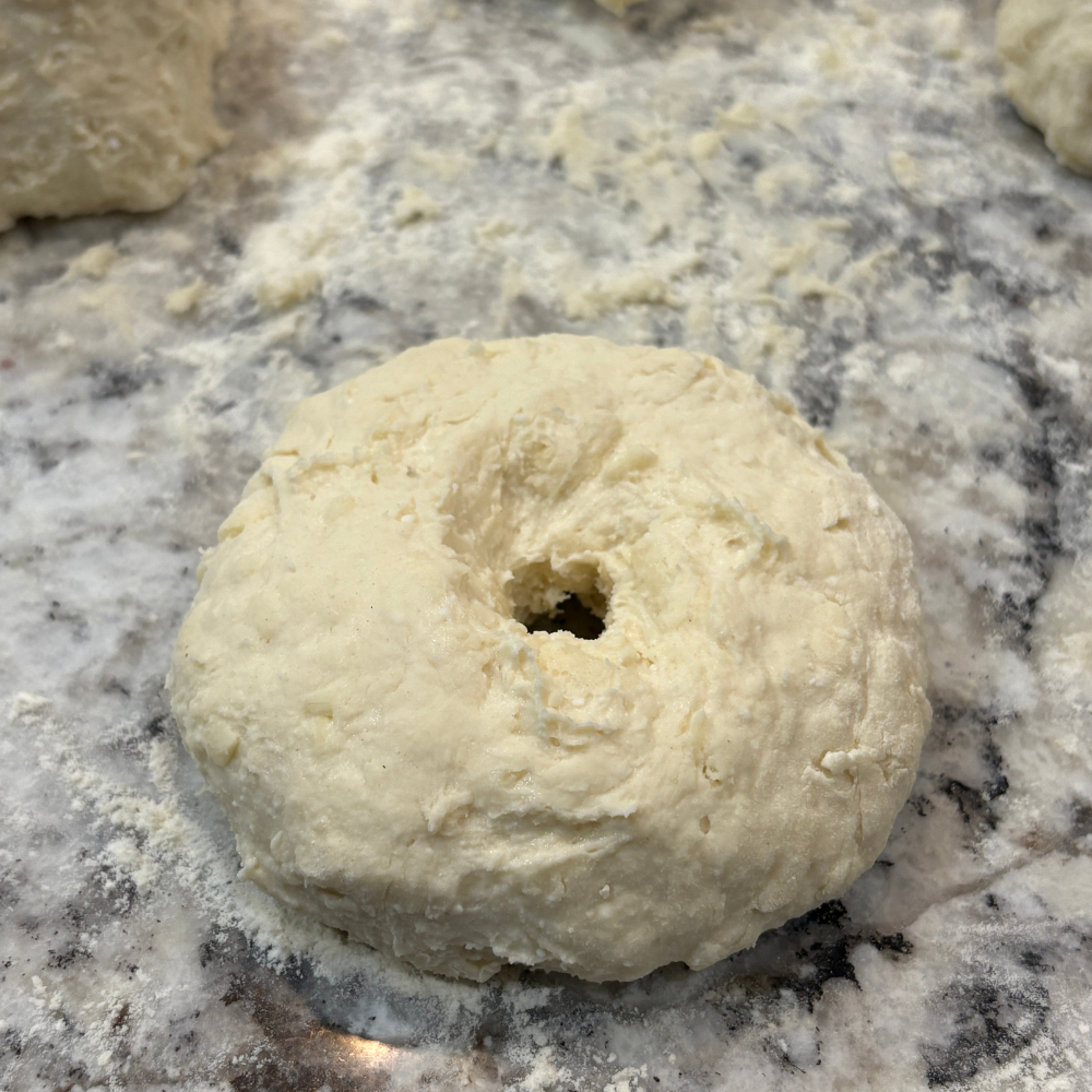 Shape the bagels: Divide the dough into six equal portions. Roll each into a ball, then gently poke a hole in the center to form a bagel shape.