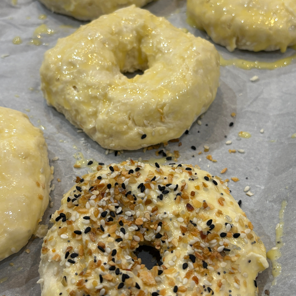 Mix 1 egg with 2 Tablespoons of water and brush on top of bagel. Sprinkle with topping of choice (i.e. everything bagel season, parmeasan, shredded cheddar & jalapeno, Cinnamon & Sugar) - be creative here!